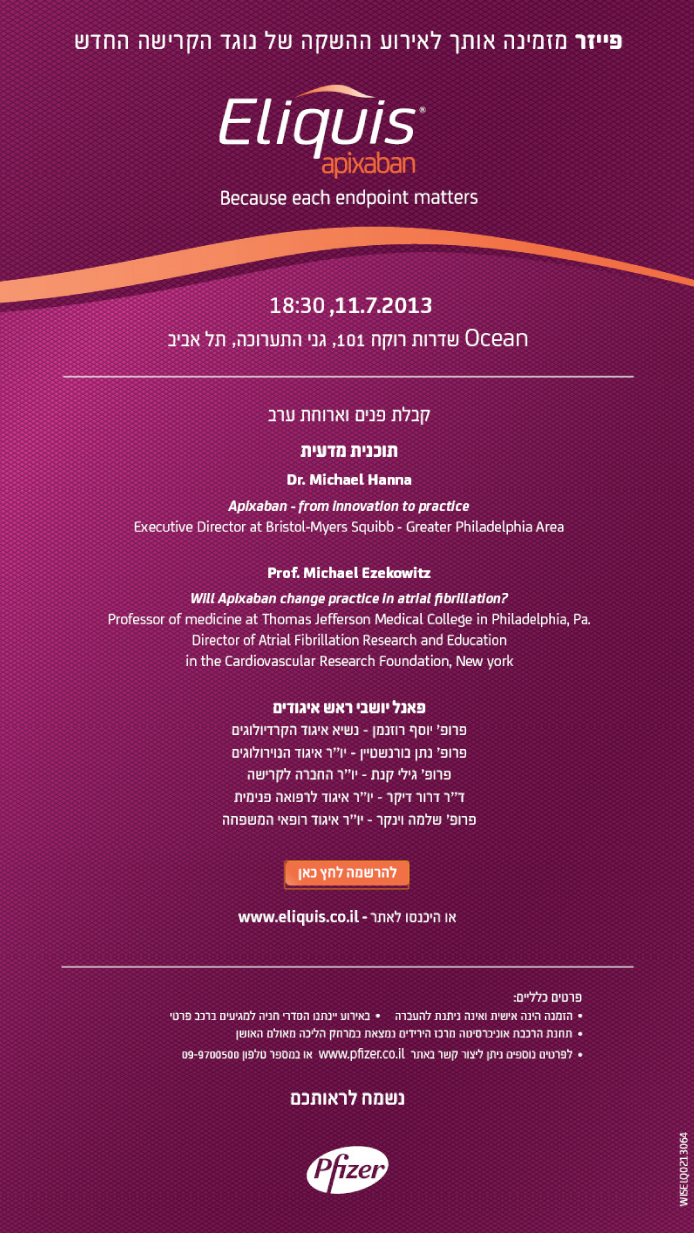 מצורפת הזמנה דיגיטלית לאירוע ההשקה של נוגד הקרישה אליקוויס/אפיקסבן,
